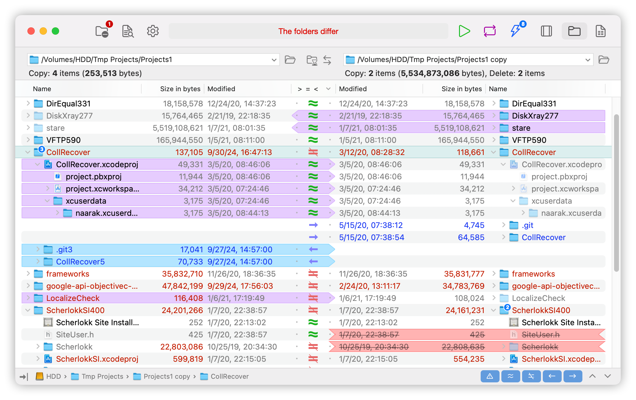 DirEqual is een geavanceerd directory vergelijkingshulpprogramma voor Mac en Windows. Het maakt het mogelijk om de kleinste veranderingen tussen mappen te detecteren en het resultaat op een duidelijke en intuïtieve manier weer te geven. De verschillen worden gemarkeerd met kleuren en pictogrammen die het verschiltype aangeven (grootte, datum of iteminhoud).