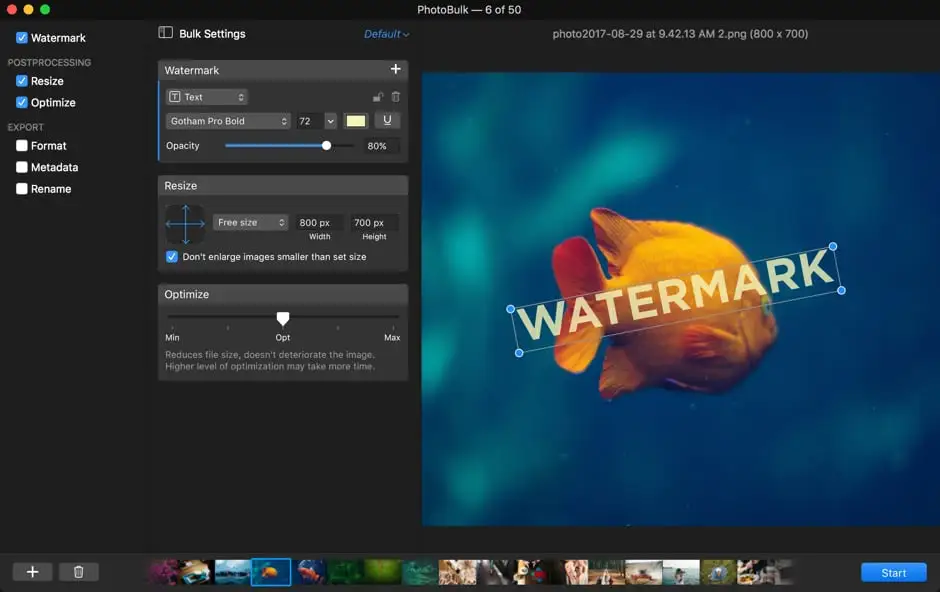 PhotoBulk is een afbeeldingseditor voor de Mac die een aantal bulk editing opties biedt: het is een batch watermark Mac app, PNG en JPEG optimizer app, en batch resize Mac software. PhotoBulk is ook een perfecte afbeeldings converter en biedt batch rename foto’s voor de Mac aan.