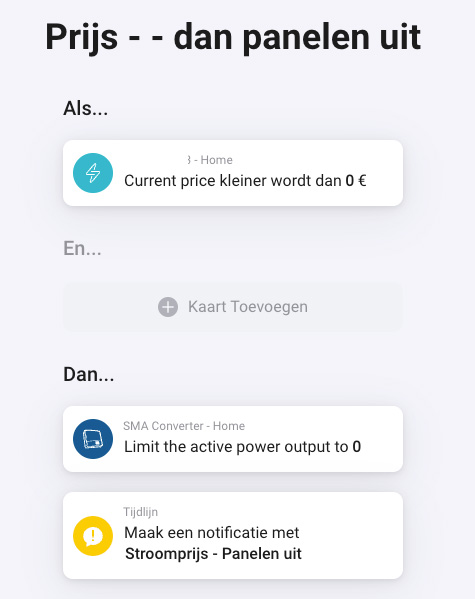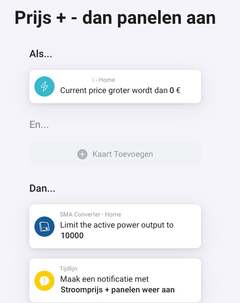 En dit werkt. Zodra de stroomprijs onder de 0 gaat schakelt de omvormer naar een output van 0 en zodra de prijs weer omhoog gaat (boven de 0 dus) gaat die weer naar vol vermogen (dit zet je dus naar wat je panelen maximaal opleveren). Tevens laat ik een notificatie achter in Homey zodat je naderhand altijd kunt zien wanneer dit gebeurt.