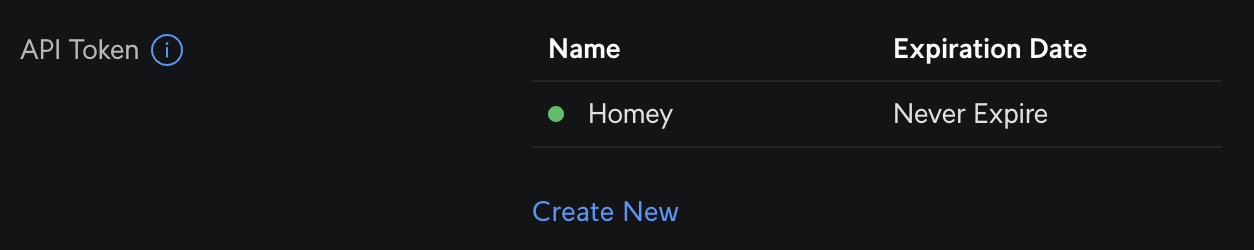 - Onder het kopje API Token maak je een key aan (bijv Homey), selecteer never expires en Create API Key