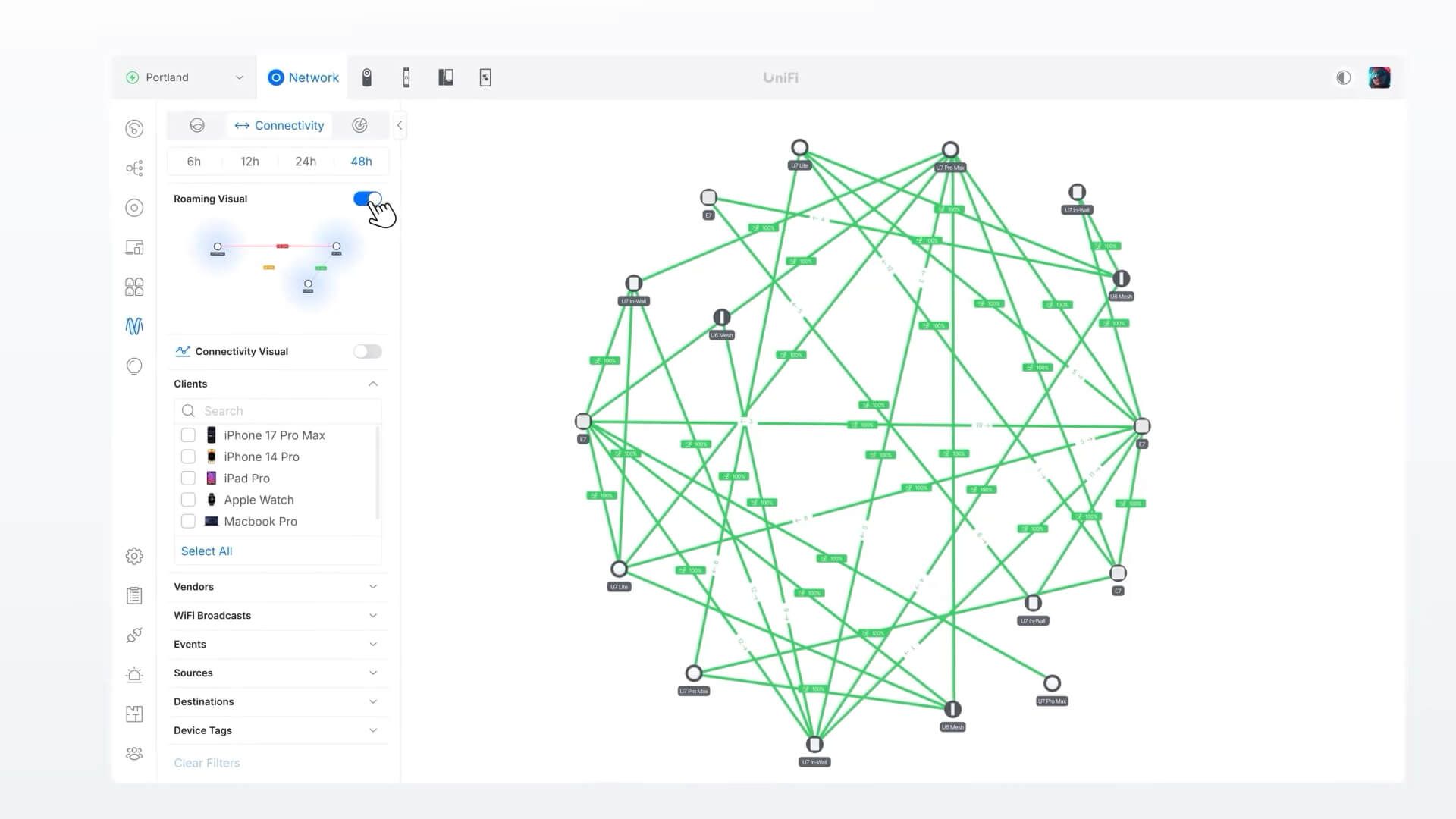Wi-Fi roaming tracking/roaming journeys (visualisatie van hoe clients tussen AP’s bewegen),